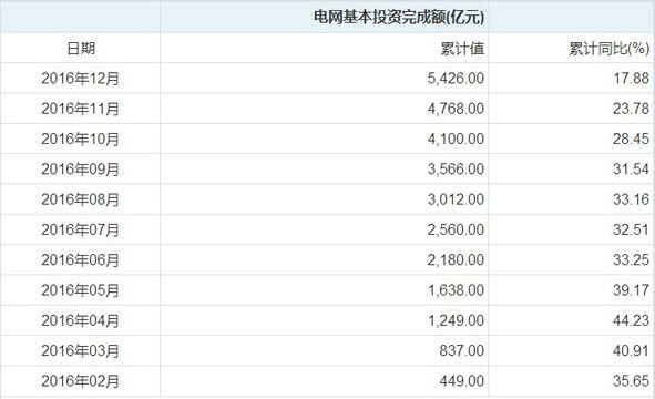 下面是2016年我國的電網(wǎng)投資完成額統(tǒng)計: